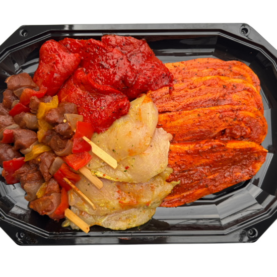 per persoon 1x Biefstuk gemarineerd 1x Speklap gemarineerd 1x Kipfilet gemarineerd 1x Varkenshaas shaslick
