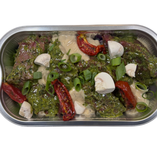 biefstuk pesto marinade champignon saus zon gedroogde tomaatjes groente mix: champignon, rode ui, prei, bosui, paksoi en sugar snaps