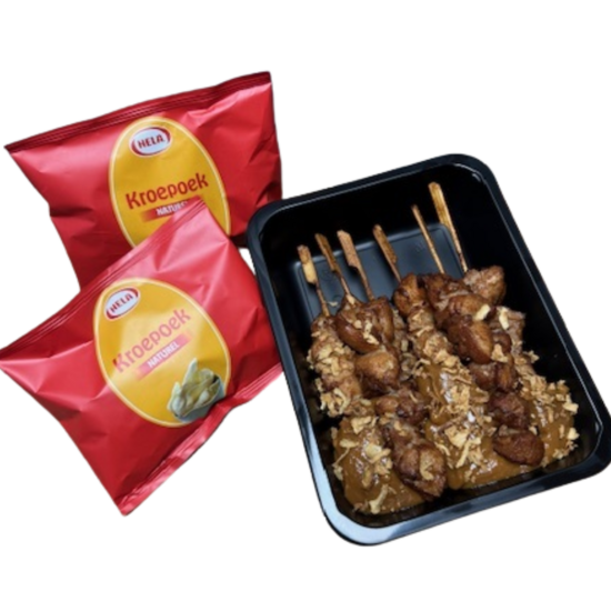 6x kipdij spies satesaus + gebakken uitjes 2x zakje kroepoek