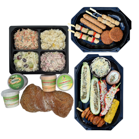 Vegetarische pakket | per persoon | € 22,95 Vlees 2 stuks vleesvervangers o.a. Vegan buger Vegetarische shaslick Vegetarische saté Vegetarische BBQ worst Groentesnack 2 per persoon o.a. Gevulde puntpaprika met rijst Gevulde courgette Gegrilde maiskolf Gevulde portabella groenteragout Gevulde portabella kruidendip Aardappelspies Salade Aardappelsalade 3 huisgemaakte salades Brood Boerderijbrood Sauzen Verdaasdonksaus Knoflooksaus Satésaus Kruidenboter maandag t/m zaterdag bezorgen wij vanaf 30,- kosten hiervan zijn dan 2,50 Vanaf 50,- gratis bezorging Op zon-feestdagen bezorgen wij alleen BBQ-pakketten of Bakplaat pakketten vanaf 10 personen. vanaf 10 personen Gratis BBQ/gasflessen en Borden en bestek erbij. (dit wordt er standaard bij geleverd vanaf 10 personen) incl. bezorgen/ophalen